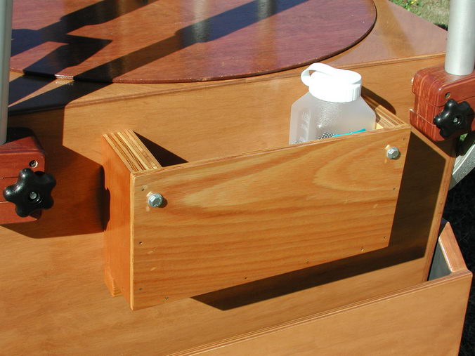 The guide scope and its wooden mount weigh in at about 26 pounds and this much weight requires a counterweight on the opposite side of the mirror box. I constructed a box and bolted it to the opposite side of the mirror box. I use this to hold an 18 amp hour battery and a juice bottle filled with lead shot. The amount of lead shot was adjusted to get a nice balance when the scope is pointed at the zenith.